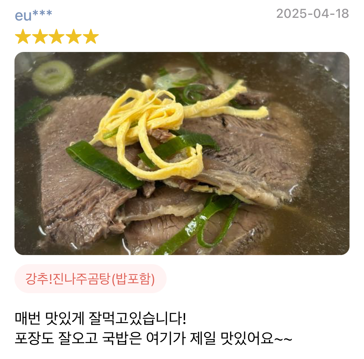 - 주력 메뉴: 나주곰탕, (특)사이즈 추천 고기 듬뿍 , 평양냉면 완전 매니아